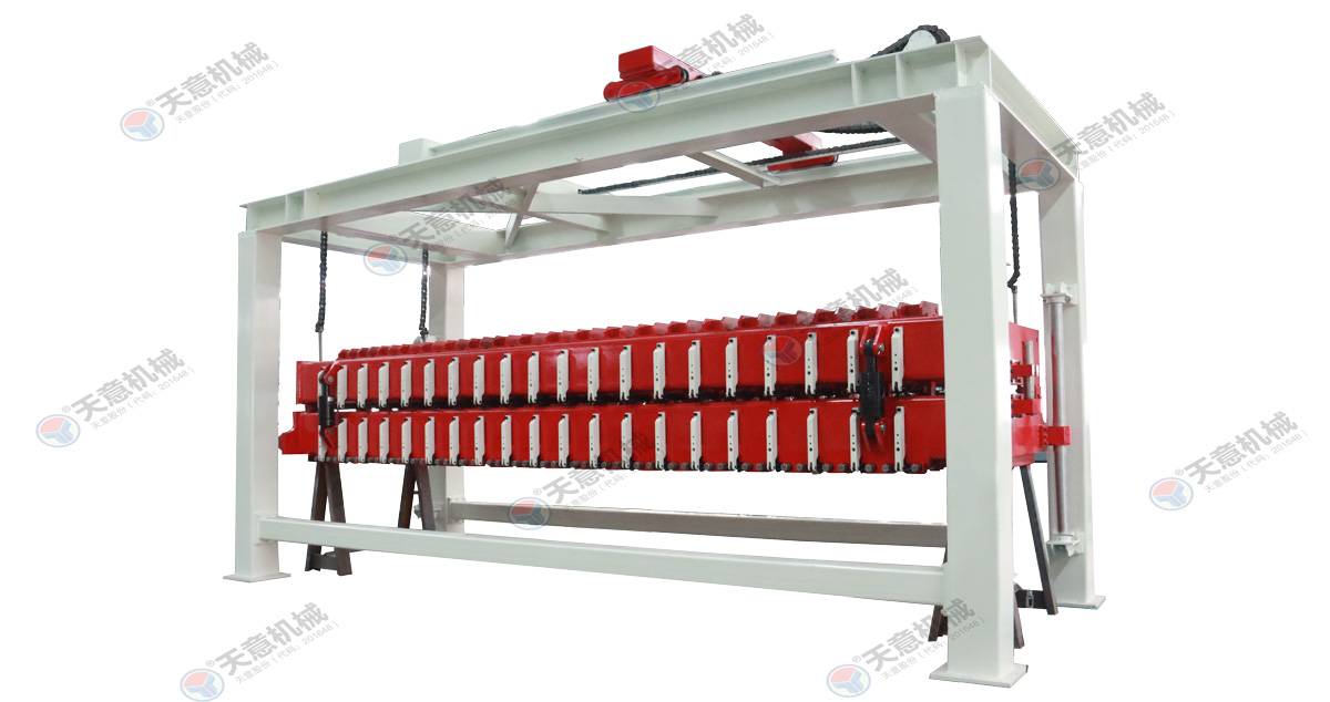 成品分垛吊機(jī):將蒸養(yǎng)車上的一模坯體吊運(yùn)至掰板輸送機(jī)上,然后將空側(cè)板吊運(yùn)至蒸養(yǎng)車上;切割工段空翻脫模機(jī)將模框翻轉(zhuǎn)90°,放在切割小車支座上進(jìn)行脫模,脫模后的??蚺c清理后的側(cè)模板進(jìn)行合模,合膜后的空??虮坏?..