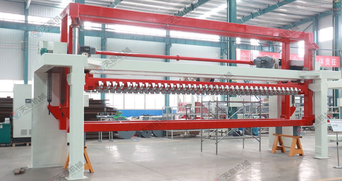 翻轉(zhuǎn)吊機(jī):抓取模箱翻轉(zhuǎn)90°,側(cè)立在切割小車上進(jìn)行切割;切割工段空翻脫模機(jī)將??蚍D(zhuǎn)90°,放在切割小車支座上進(jìn)行脫模,脫模后的??蚺c清理后的側(cè)模板進(jìn)行合模,合膜后的空模框被吊運(yùn)至模具回程軌道上進(jìn)行涂油處...