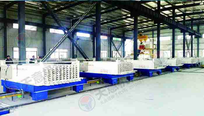 TY12型墻板生產(chǎn)線包括:墻板成型機(jī)、整體穿抽管系統(tǒng)、發(fā)泡系統(tǒng)、水箱、電子計(jì)量儲(chǔ)料倉、螺旋上料輸送機(jī)、儲(chǔ)料罐、螺旋輸送機(jī)、EPS熟化料倉、硫化干燥床、EPS預(yù)發(fā)機(jī)、數(shù)控配電室、發(fā)泡攪拌機(jī)、整體出板系統(tǒng)、叉車、成品堆放區(qū)、擺渡車。